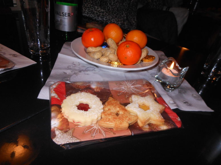 Es scheint irgendwie ein ungeschriebenes Gesetz zu sein, dass alle die Erika-Guezli mit nach Hause nehmen, wohl um sie am andern Tag mit der Familie zu geniessen. Alle halten sich lieber an die gefüllten «Weihnachtsteller» und naschen da Mandarinen, Nüssli und Guezli.
