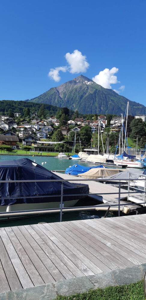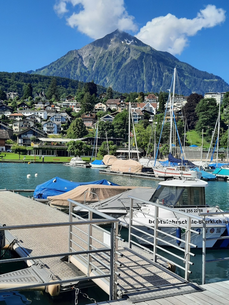 Fahrt nach Spiez, bei herrlichem Wetter, der Niesen bietet sich einem so richtig an, wie ein Fotomodell, er ist sich halt seiner Wirkung bewusst, hat weder Degen noch Kragen, nicht einmal einen Hut, nur blauer Himmel rundherum.