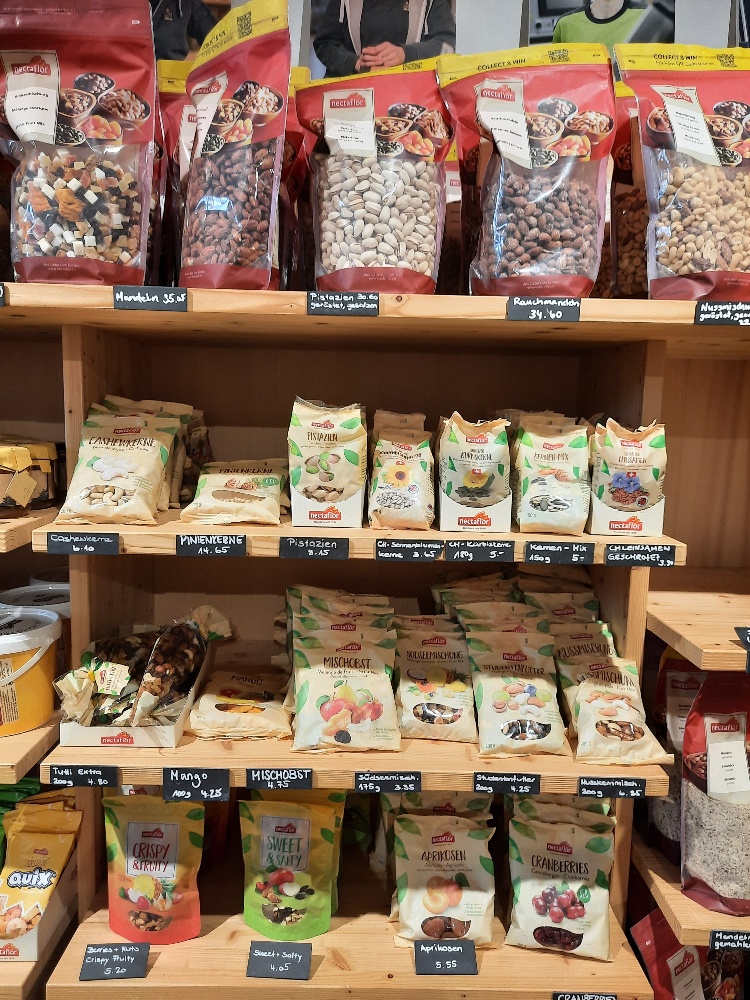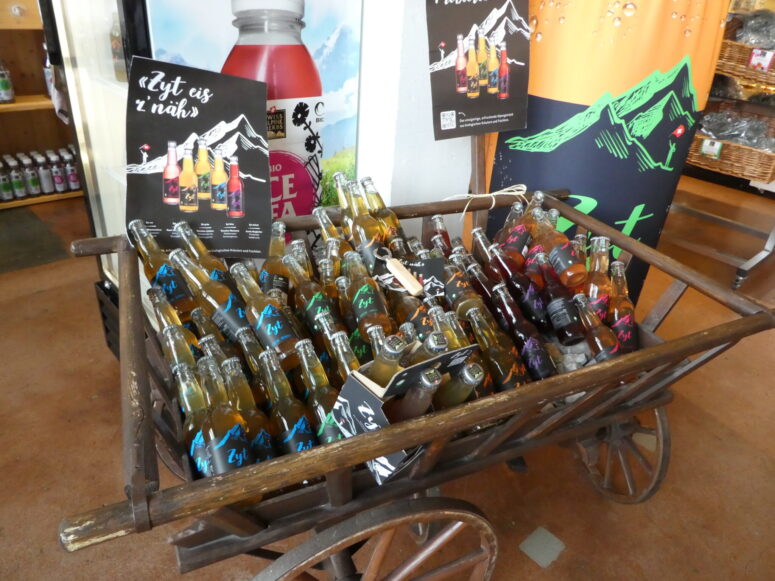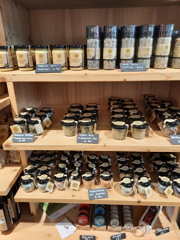 Nun geht es nach Därstellen in den Kräutergarten der Swiss Alpine Herbs. Eine Gruppe hat sich für die Führung angemeldet, eine andere möchte sich lieber direkt im Bio-Laden umsehen. So ein Shop geht für die Frauenverein-Frauen halt immer, ob Seife oder Holzchueli, lädele passt immer. Kräutertee, Gewürze, besondere Salzmischungen, Risotto oder Polenta, gesunde Süssgetränke, kleine und grössere Geschenkkörbe und . . . . . Ingwer-Shot, nein, werde ich belehrt, enthält keinen Alkohol, heisst trotzdem Shot. Gefühlt macht der Shop in den zwei Stunden unserer Anwesenheit mindestens einen Wochenumsatz!