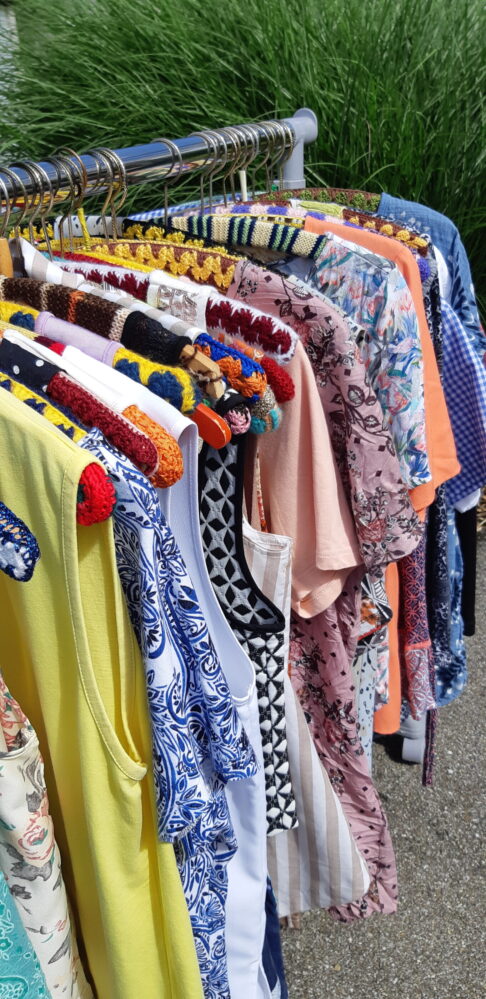 Recht kühl das Wetter, so für Mitte Juni, aber der Stand ist parat, die Kundschaft trifft ein, und schon wird geschaut und gewählt und gekauft und verkauft. Sonnenhüte sind grad noch nicht gefragt, vielleicht später, denn das Wetter bleibt doch besser als befürchtet. Und sobald die Sonne kommt, wird es warm, und dann wäre doch so ein Sonnenhut ganz praktisch . . . . .