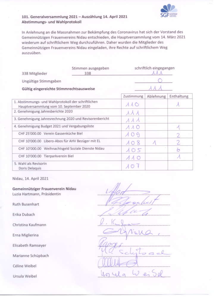 In Anlehnung an die Massnahmen zur Bekämpfung des Coronavirus hatte sich der Vorstand des Gemeinnützigen Frauenvereins Nidau wiederum entschieden, die Hauptversammlung 2021 auf schriftlichem Weg durchzuführen. Dazu wurden die Mitglieder im Februar 2021 eingeladen, ihre Rechte mittels des ihnen zugestellten Abstimmungs- und Wahlprotokolls bis am 9. April 2021 auszuüben.