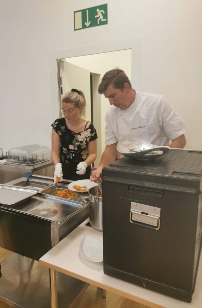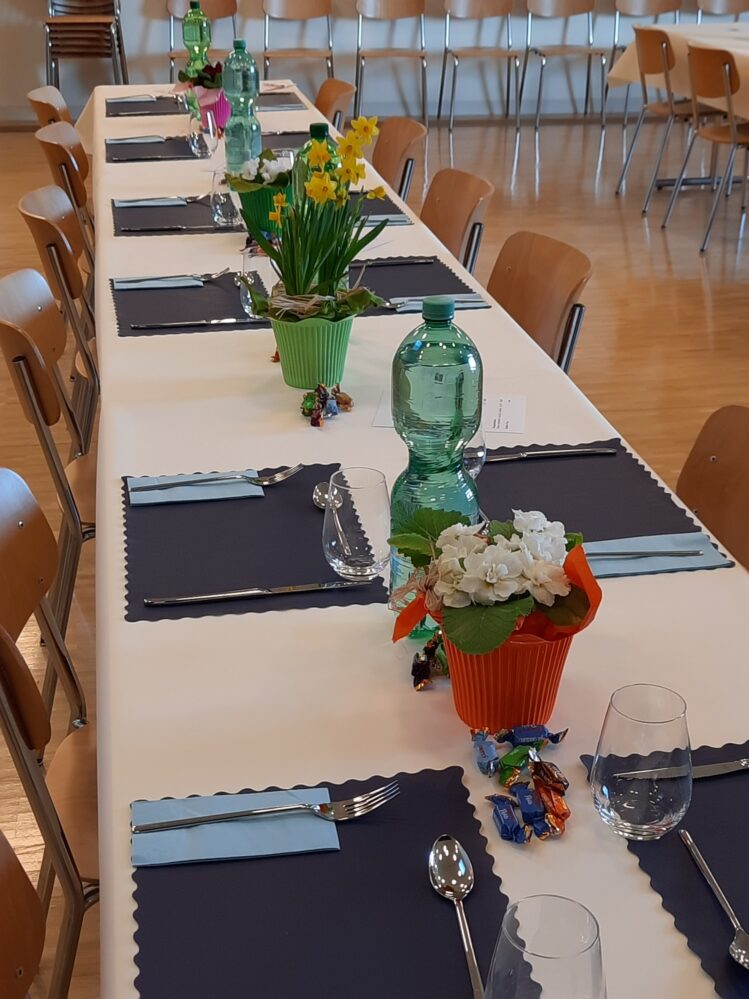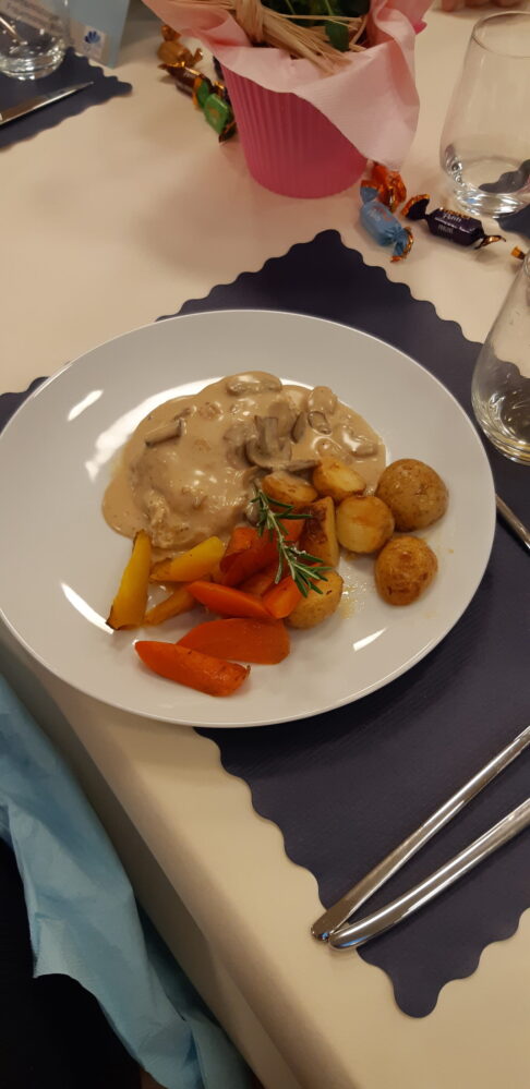 Dieses Jahr haben uns Gabael und Jessica Houmard, Gourmet Wave Catering Port mit einem ganz feinen Essen verwöhnt, in einer Aula mit geschmückten Tischen, so wie wir es uns halt gewöhnt sind. Merci Christina, Erika und Elisabeth.