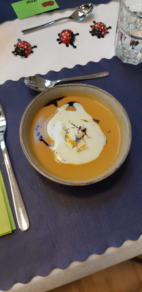 Die Aula sieht wieder toll aus, die Tischreihen mit weissem Tischtuch, blauen Servietten und dem Tischschmuck, jedes Jahr überraschen uns Erika und Elisabeth mit neuen Kreationen, diesmal haben wir eine farbige Rose in einer wunderbaren Porzellantasse, mit Untertasse natürlich.