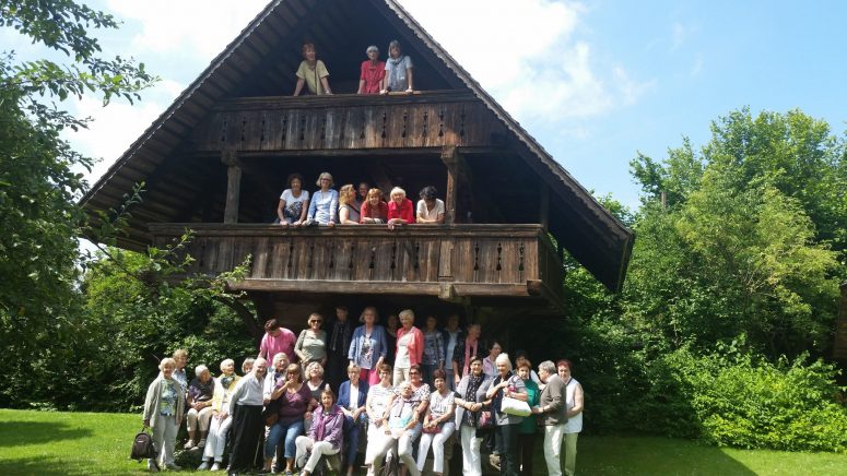 Der erste Halt ist der Gemüsebauernhof der Familie Aebersold in Treiten, da gibt es Kaffee und Züpfe. Aber was macht Ruth da vorne am Steuer, sie fährt ja falsch. Und schon tönt es aus dem Lautsprecher: „Keine Angst, ich weiss schon, wo Treiten ist, aber ich komme mit dem Car eben nicht ganz überall durch!“ Also, zurücklehnen und vertrauen. Auf dem Hof werden wir bewirtet und erfahren, dass sie für 49 Personen, ihre Familienmitglieder, Angestellte und Erntehelferinnen und -helfer Mittagessen vorbereiten müssen. Da könnten wir doch grad bleiben und die Bauernhofleute auf den Mont Vully schicken! Der Vorschlag findet keinen Anklang. Weiter geht die Reise auf den Jerisberghof bei Gurbrü ins Bauernmuseum Althuus. So romantisch wie es sich anhört und anzuschauen ist, manch eine von uns ist froh, nicht in jenem Jahrhundert gelebt zu haben, jedenfalls nicht als Magd. Wir geniessen eine interessante und kompetente Führung, mit allerlei Anekdoten. So hören wir, dass der Bauernhof in einem fernen Jahrhundert total abgebrannt sei: die Meisterfrau habe eine Magd weg geschickt, welche etwas mit einem Knecht gehabt habe. Könnte ja eigentlich der Meisterfrau Wurst sein, es sei denn, es wäre „ihr“ Knecht gewesen . . . und da habe die Magd scheint’s Feuer gelegt. Von Ferenbalm geht es weiter auf den Mont Vully, für Ruth nicht gerade eine Strecke, bei der sie im Car den Autopiloten einsetzen kann. Im Hotel Mont Vully geniessen wir ein feines Mittagessen, mit Blick auf den Murten See, auf Felder und Wälder und Reben, bei sommerlich heissen Temperaturen, und fast alle sind viel zu warm angezogen!